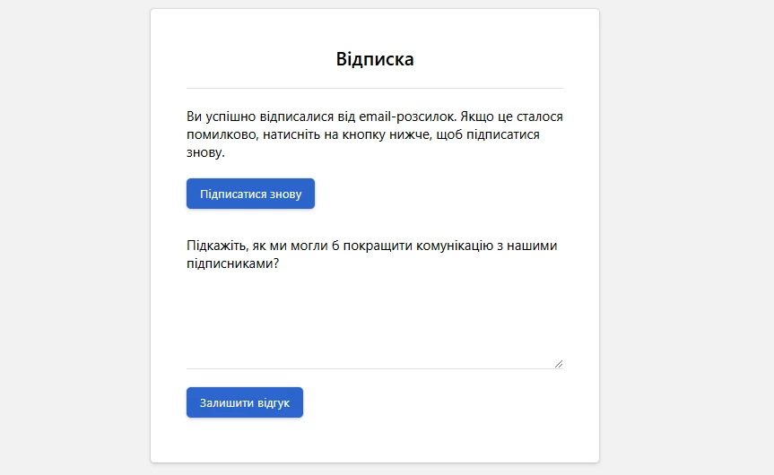 Сторінка відписки має кнопку Підписатися знову та поле для введення відгуку про причину.