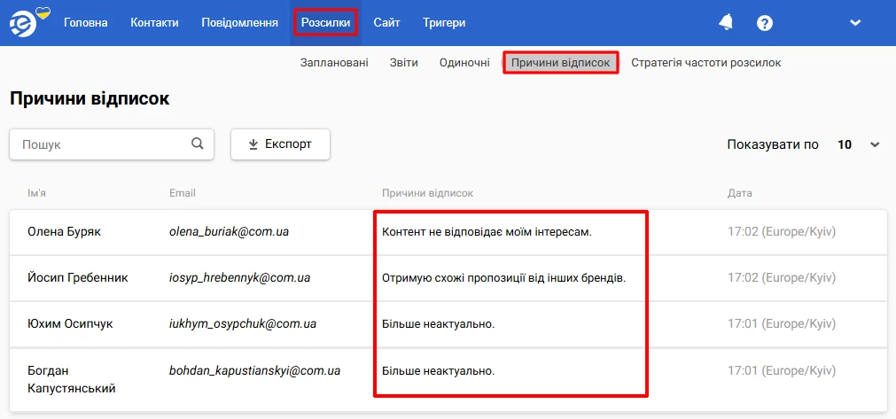 Якщо на сторінці відписки є поле для коментаря або вказівки причини, ці дані можна переглянути у розділі Розсилки → Причини відписок.