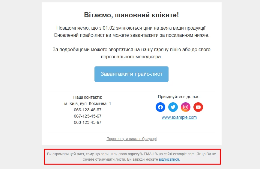 - Текст посилання повинен чітко вказувати на можливість відписки.