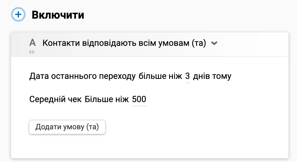 Умовна група дозволяє об'єднати підписників за одним або кількома параметрами в системі. Склад створеної групи буде змінюватись залежно від того, відповідає цей контакт вибраним вами умовам чи ні.