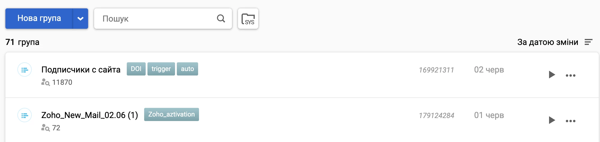 Створюйте групи для визначення цільової аудиторії у проморозсилках та автоматизації під час роботи з невеликими сегментами. Правильно складені групи – запорука успіху маркетингової компанії. Невелика група правильно вибраних контактів дає більшу користь, ніж масова розсилка по всій базі.