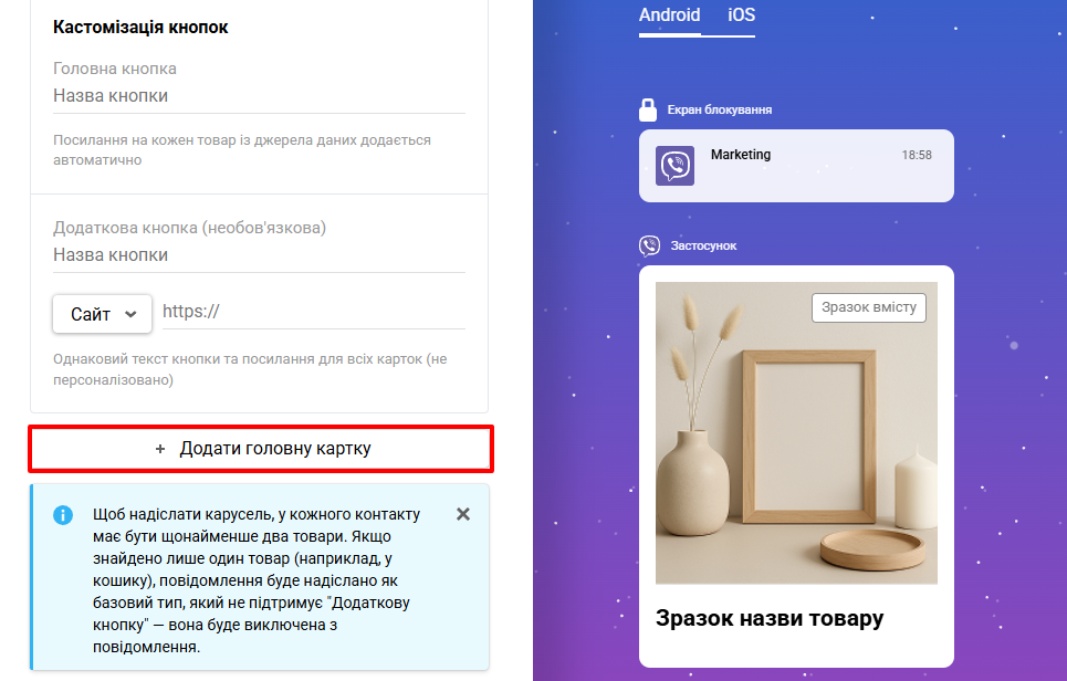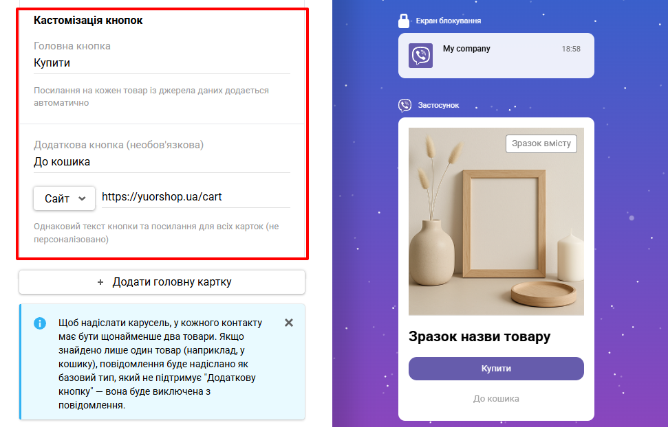 - Якщо замість каруселі надсилається базове повідомлення, то додаткова кнопка буде прихована, оскільки у базовому повідомленні вона не передбачена.