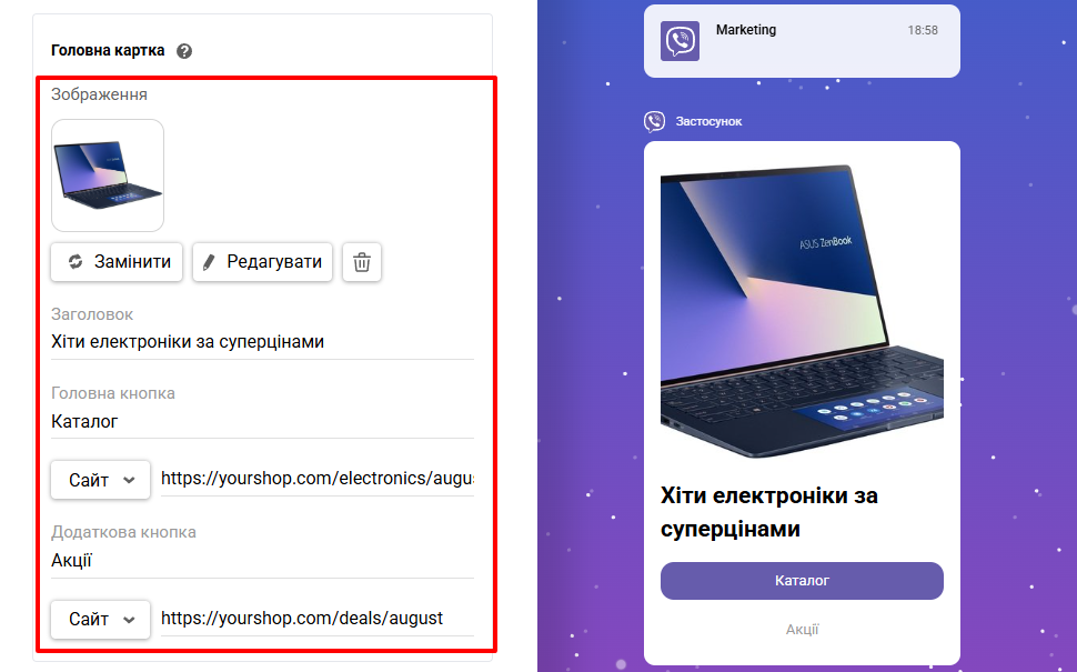 - Додайте інші необхідні основні та додаткові параметри повідомлення. Детальніше про створення Viber-повідомлень >