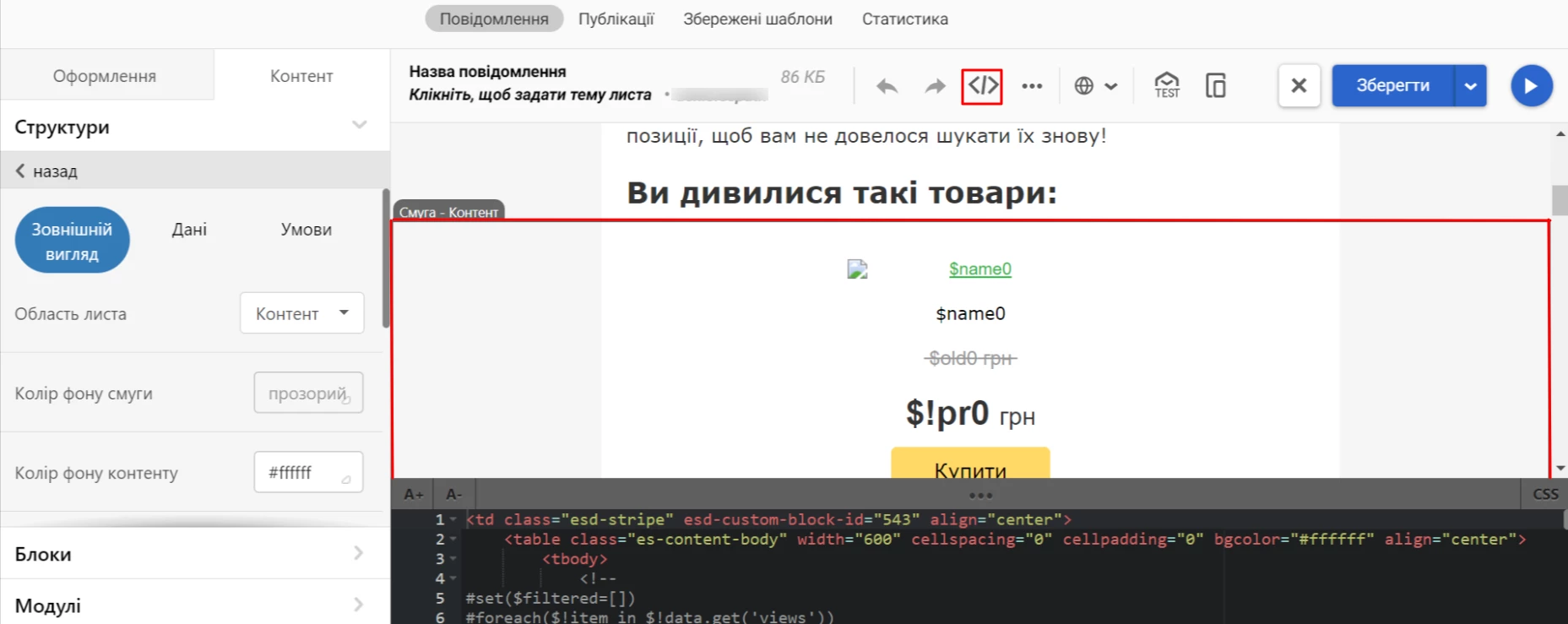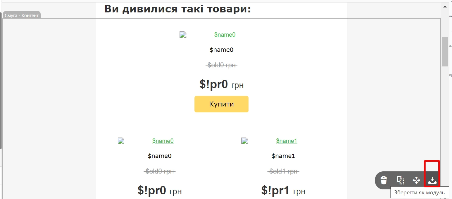 Рекомендаційні блоки в листі розміщуються в окремій смузі, в коді якої задані правила підстановки динамічних даних.