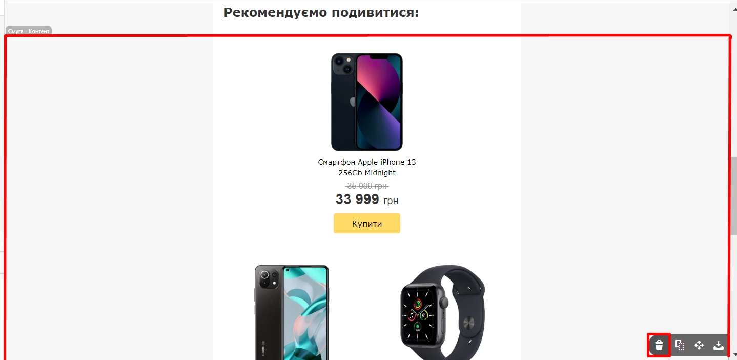 8. Видаліть із шаблону ілюстративну смугу з товарними картками (Рекомендуємо подивитися).