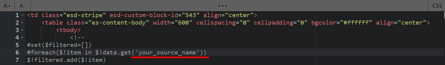 5. У рядку #foreach($item in $data.get('views')) замініть views на назву джерела, яке ви створили на основі алгоритму Покинутий перегляд (до 6 товарів).