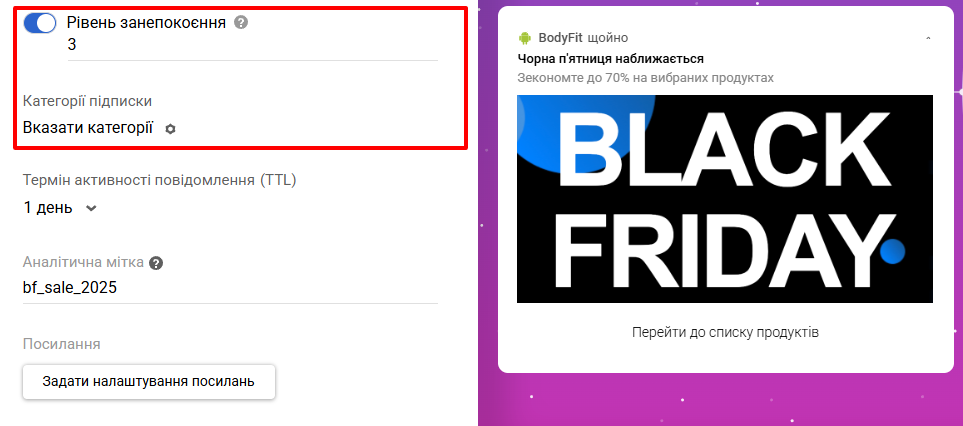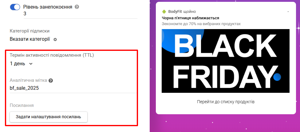 - Аналітична мітка. Використовується у Firebase та Google Analytics для аналітики, відстеження та оцінки ефективності повідомлення.