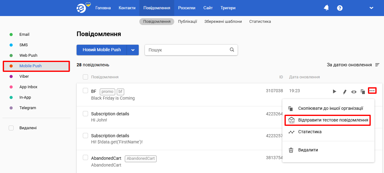 - Через список повідомлень — відкрийте меню з трьома крапками справа від назви повідомлення та виберіть Відправити тестове повідомлення.