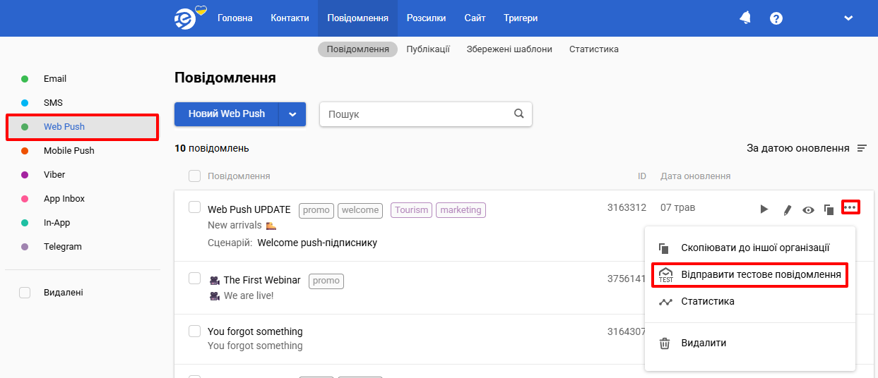 - Через список повідомлень — відкрийте меню з трьома крапками справа від назви повідомлення та виберіть Відправити тестове повідомлення.