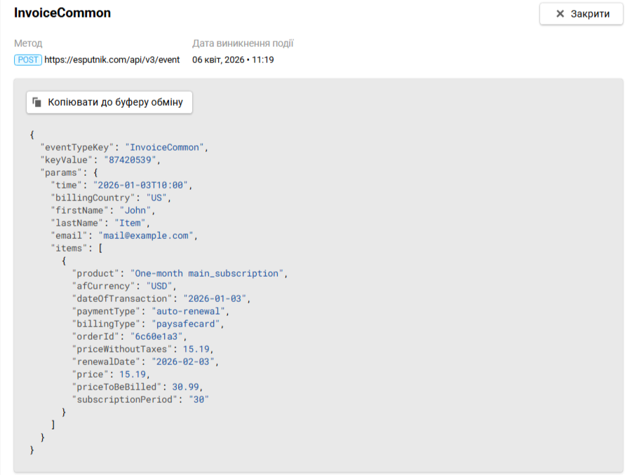 | Параметри події | Лише всередині сценарію, запущеного цією подією | $deliveryMethod, $items[0].name |