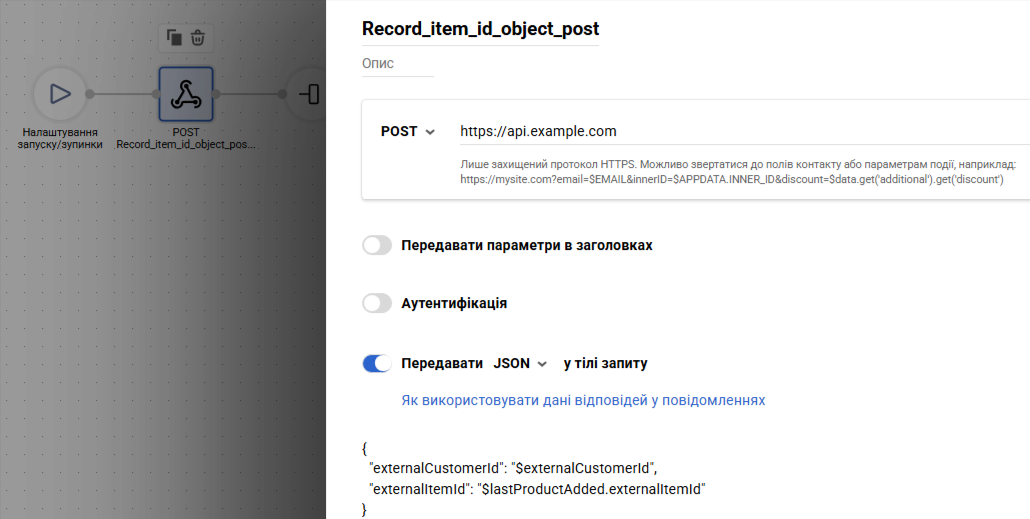 - POST: передати вибрані дані події або контакту в зовнішню систему (для логування, оновлення CRM, аналітичних пайплайнів, запуску зовнішніх процесів).