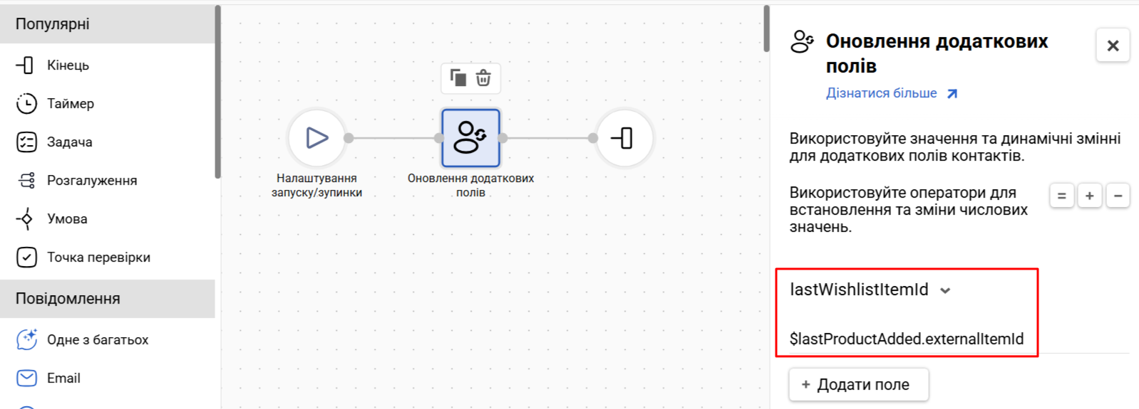 - Розгалуження в сценаріях — направляйте контакти різними шляхами залежно від того, який товар було додано в обране.