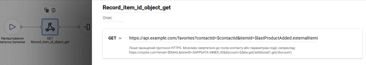 - GET: запитати дані із зовнішньої системи (наприклад: доступність товару, персональна знижка, рекомендований товар) і за потреби зберегти отримані значення в eSputnik.