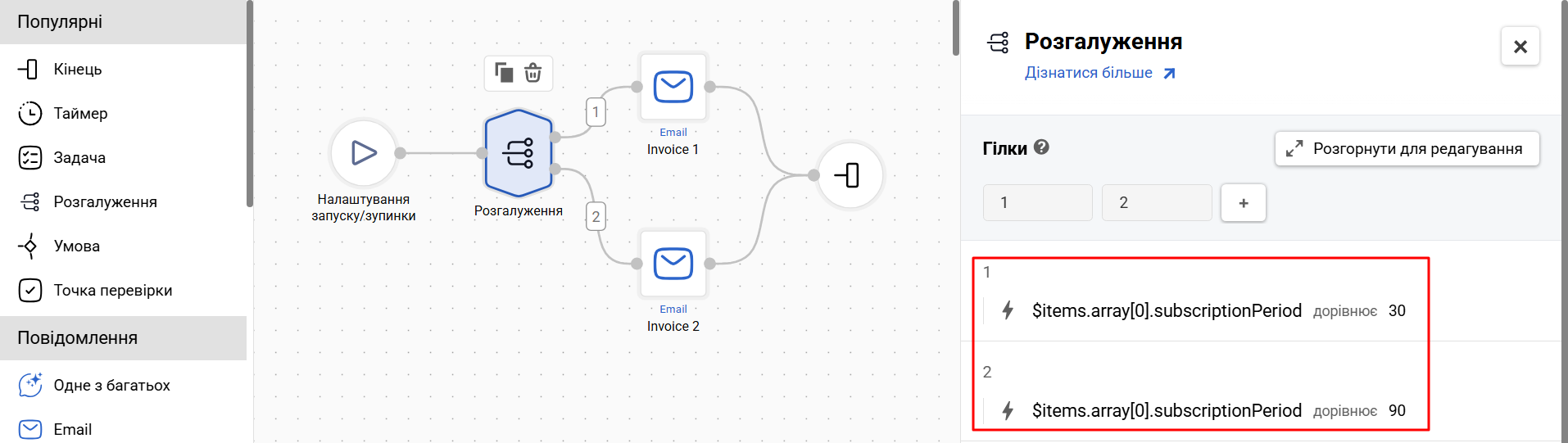 $items.array[0].subscriptionPeriod. - Контакт переходить у відповідну email-гілку залежно від значення.