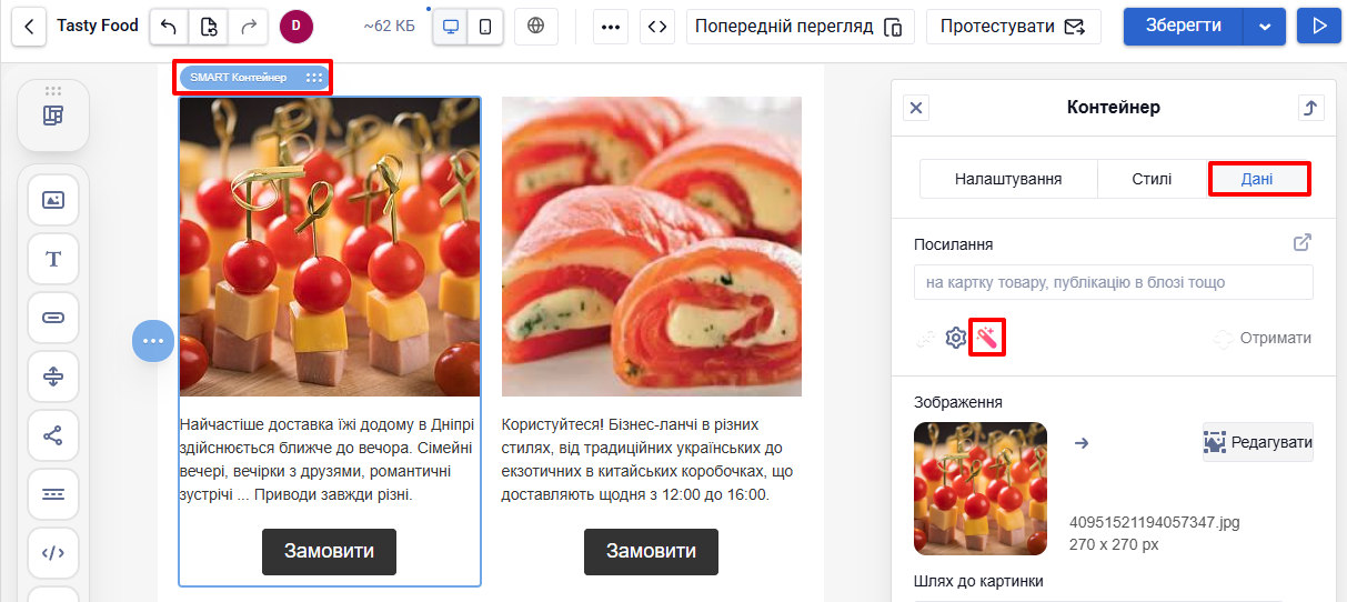 Щоб оптимізувати текст у SMART-контейнері згідно з інформацією за посиланням на сторінку товару, виділіть контейнер у листі та натисніть Покращити з AI.