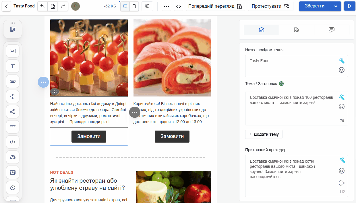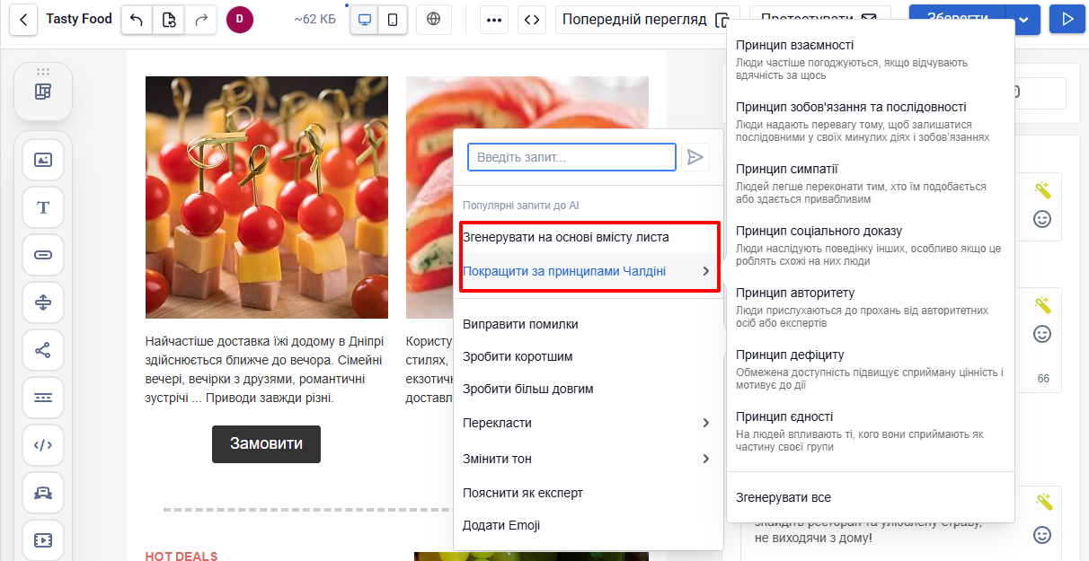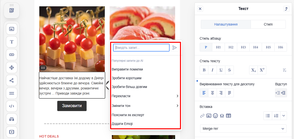Штучний Інтелект (ШІ) у текстовому блоці email-редактору надає можливість безпосередньо у шаблоні перекласти або оптимізувати текст: виправити помилки, змінити стилістику тощо. Алгоритми машинного навчання (ML) та обробки природної мови (NLP) допомагають легко створити якісний контент, який підвищить залученість ваших підписників.