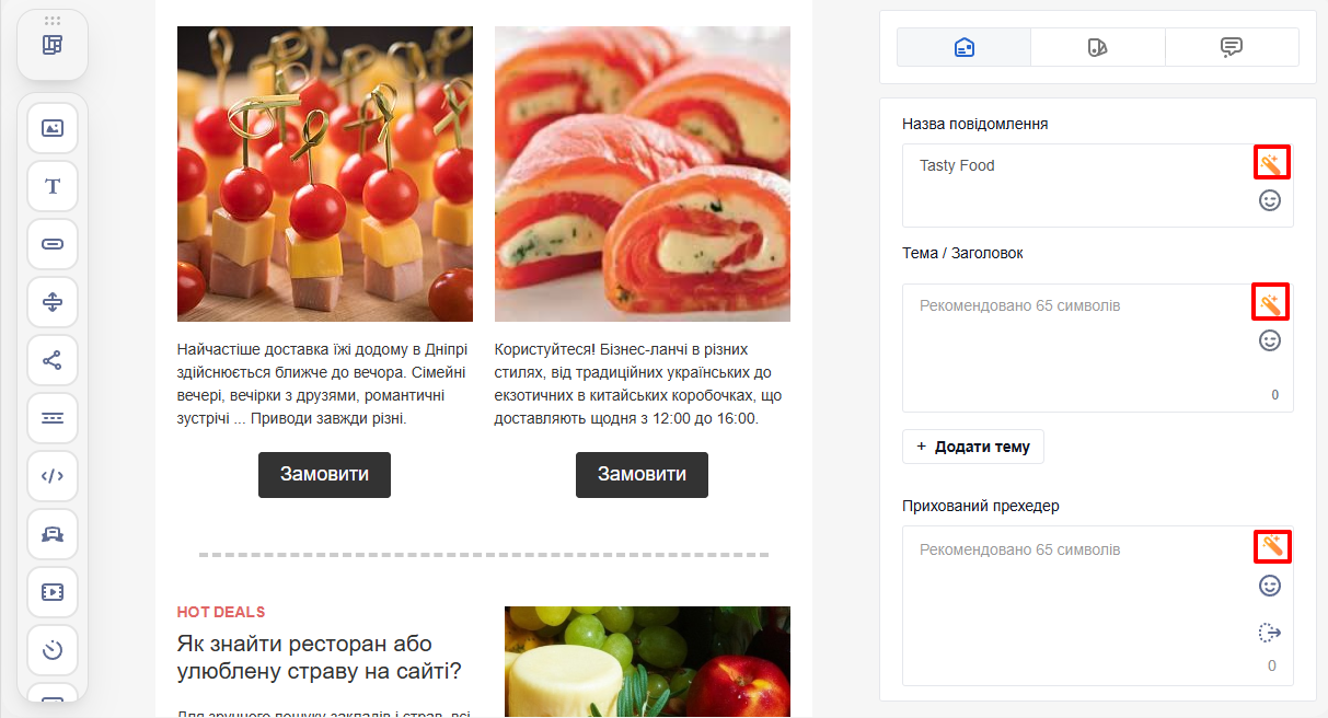 - Щоб згенерувати або оптимізувати назву, тему та прехедер листа, натисніть кнопку Покращити з AI у відповідному полі.