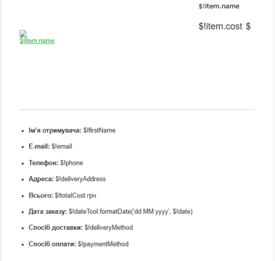 Наприклад, щоб показати спосіб оплати в email, помістіть змінну $!paymentMethod у відповідний блок шаблону.