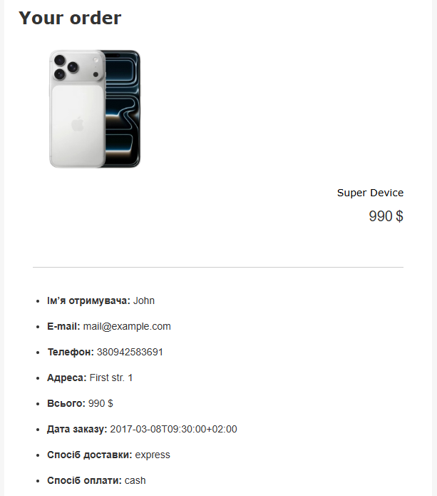 Для приклада додамо у лист з підтвердженням замовлення динамічні дані по замовленню. Ви можете створити будь-яке інше повідомлення за допомогою тих самих принципів (див. як персоналізувати email залежно від параметрів профілю контакту).