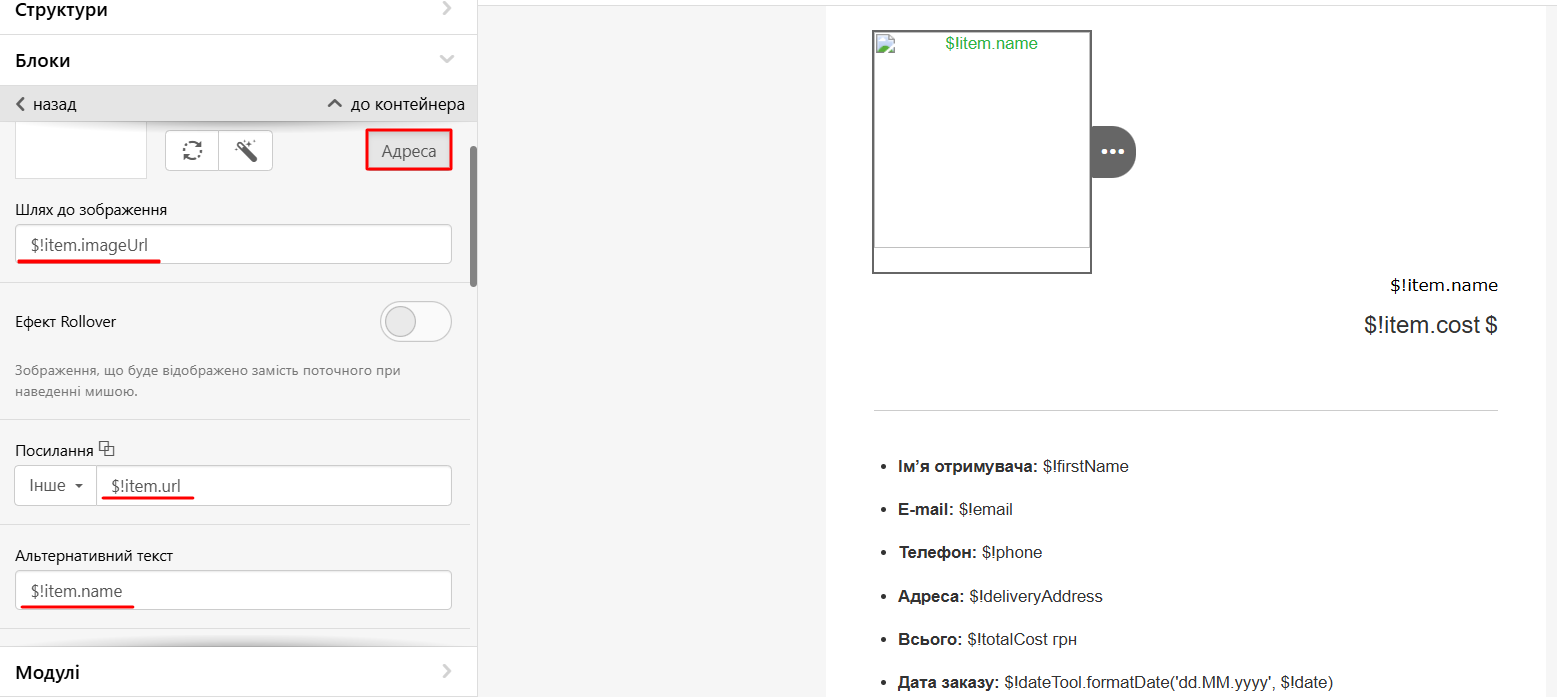 - Щоб додати динамічні змінні для зображення, натисніть потрібне зображення → Адреса та вставте: