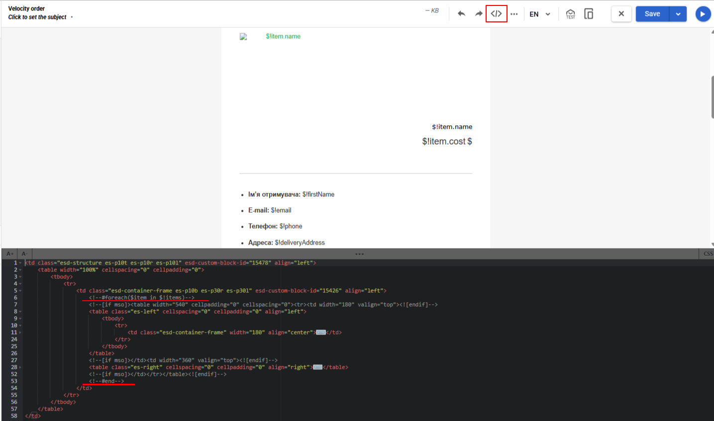 - Використовуйте Velocity, щоб додати динамічні змінні до блоків, де мають підставлятися персоналізовані дані. Кількість змінних та їх назви залежатимуть від контенту повідомлення.
