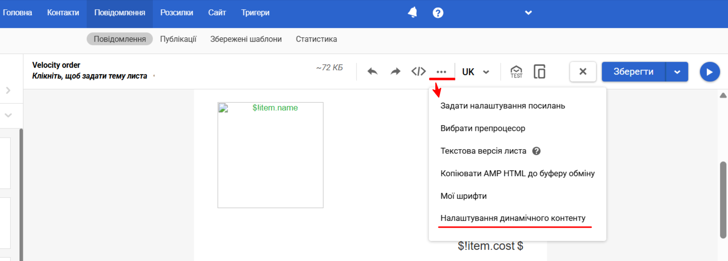 Щоб побачити повідомлення з динамічним контентом натисніть Додаткові параметри (значок Три крапки) → Налаштування динамічного контенту.
