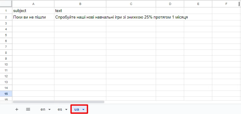 ПриміткаЩоб активувати використання Google-таблиць для мультимовних повідомлень, зверніться до служби підтримки за адресою [email protected]