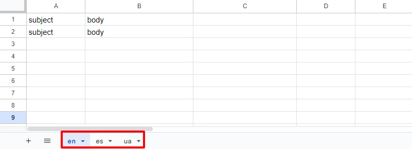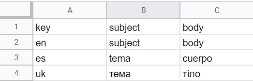 Значення у першому рядку – ключі, які використовуються в повідомленні, а другий рядок – значення ключів для мовної версії. Назви листів є кодами мов відповідно до специфікації ISO 639-1.