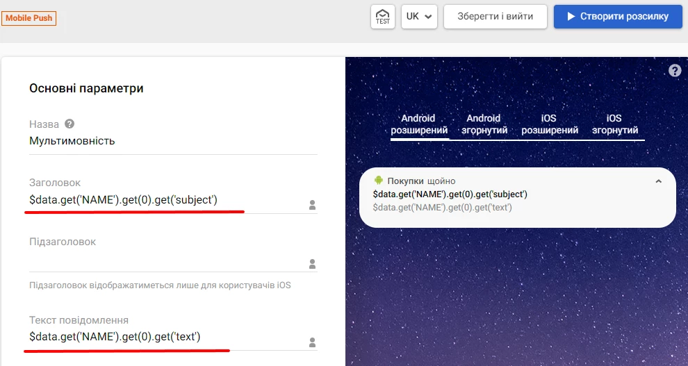 Щоб використовувати джерело даних Google-таблиця у повідомленні, додайте в редакторі змінні у такому вигляді: