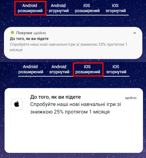 - Текст повідомлення: Спробуйте наші нові навчальні ігри зі знижкою 25% протягом 1 місяця.