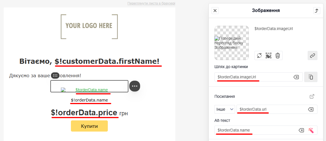 }Web Push повідомлення також може містити динамічний контент, для цього замість логотипа, великого зображення і посилань у редакторі повідомлень потрібно прописати змінні: