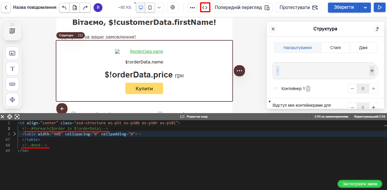 Щоб отримати доступ до даних із масиву, в повідомленні треба використовувати конструкцію вбудованого у velocity циклу foreach. На прикладі масиву orderData velocity-код набуває вигляду: