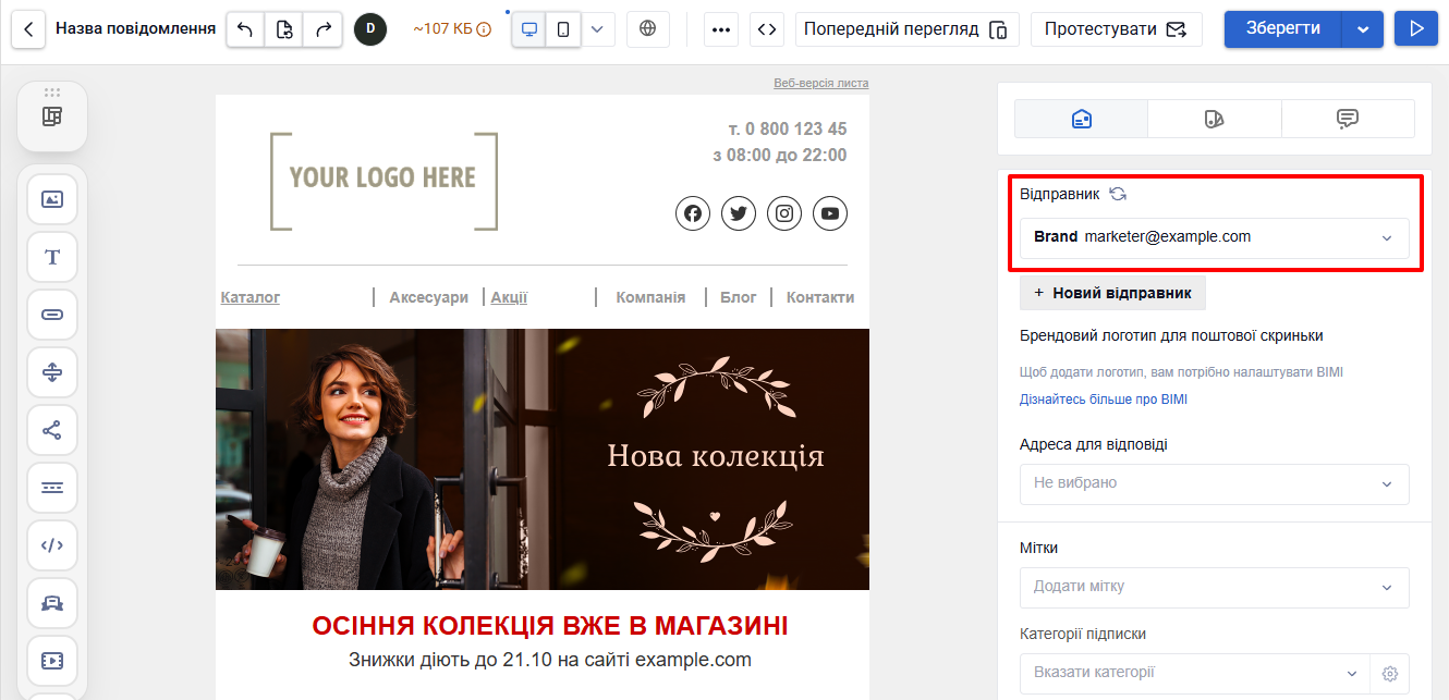 Замість змінної discount буде підставлено значення 5%, а для кнопки замість змінної link у ролі посилання буде підставлено значення: https://site.com/items_for_sale.