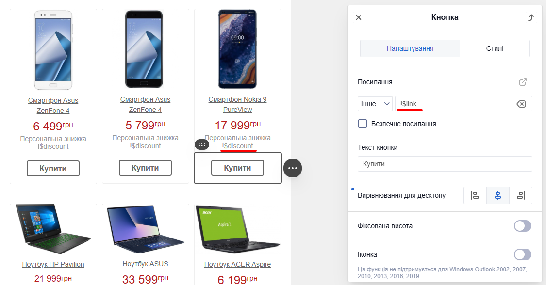 $!discount— замість розміру знижки$!link— в налаштуваннях кнопки (тип посилання — Інше).