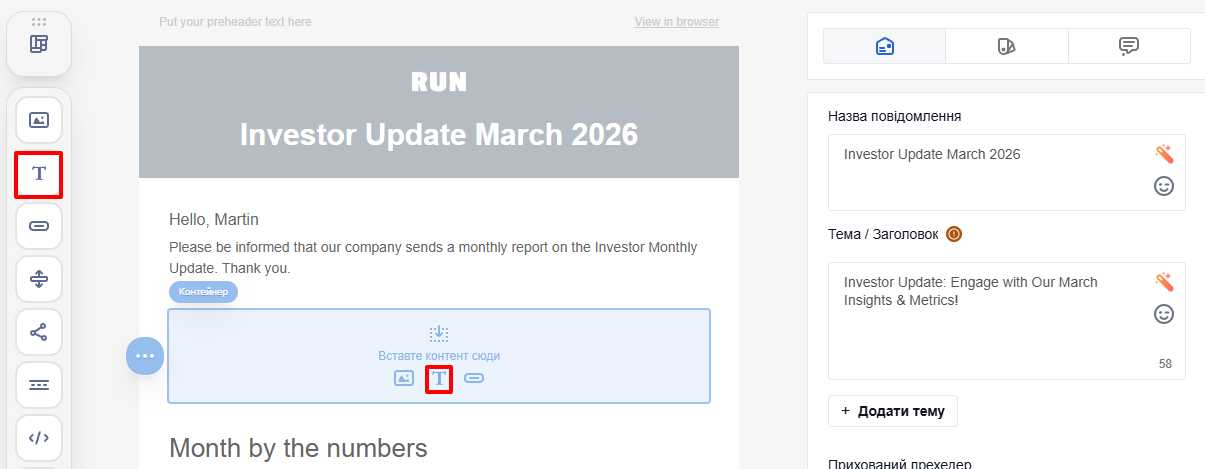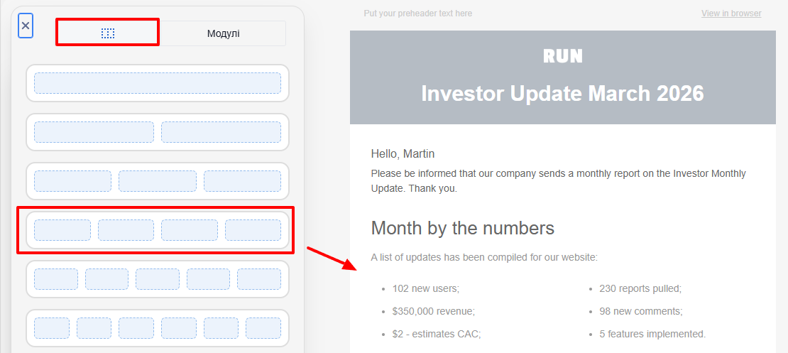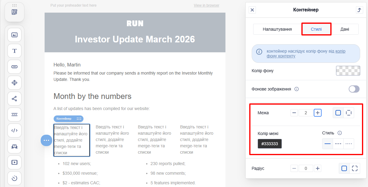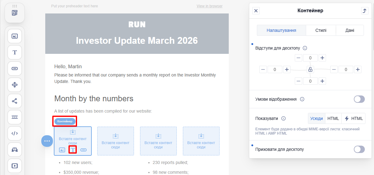 - Перейдіть до панелі редактора Структури й модулі, відкрийте вкладку Розмітка та перетягніть у повідомлення структуру з контейнерами.