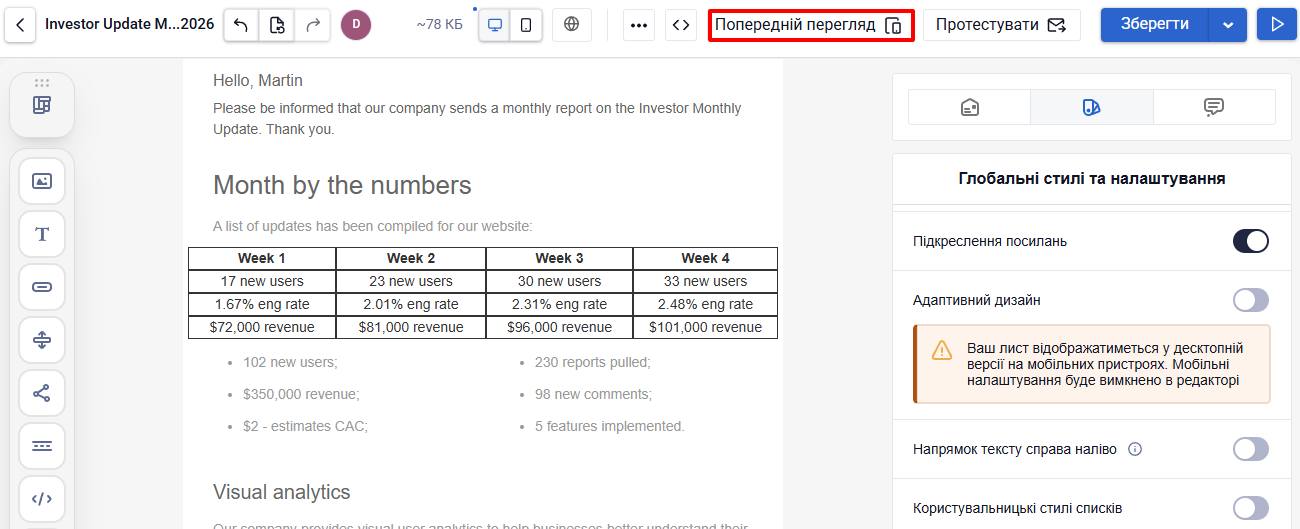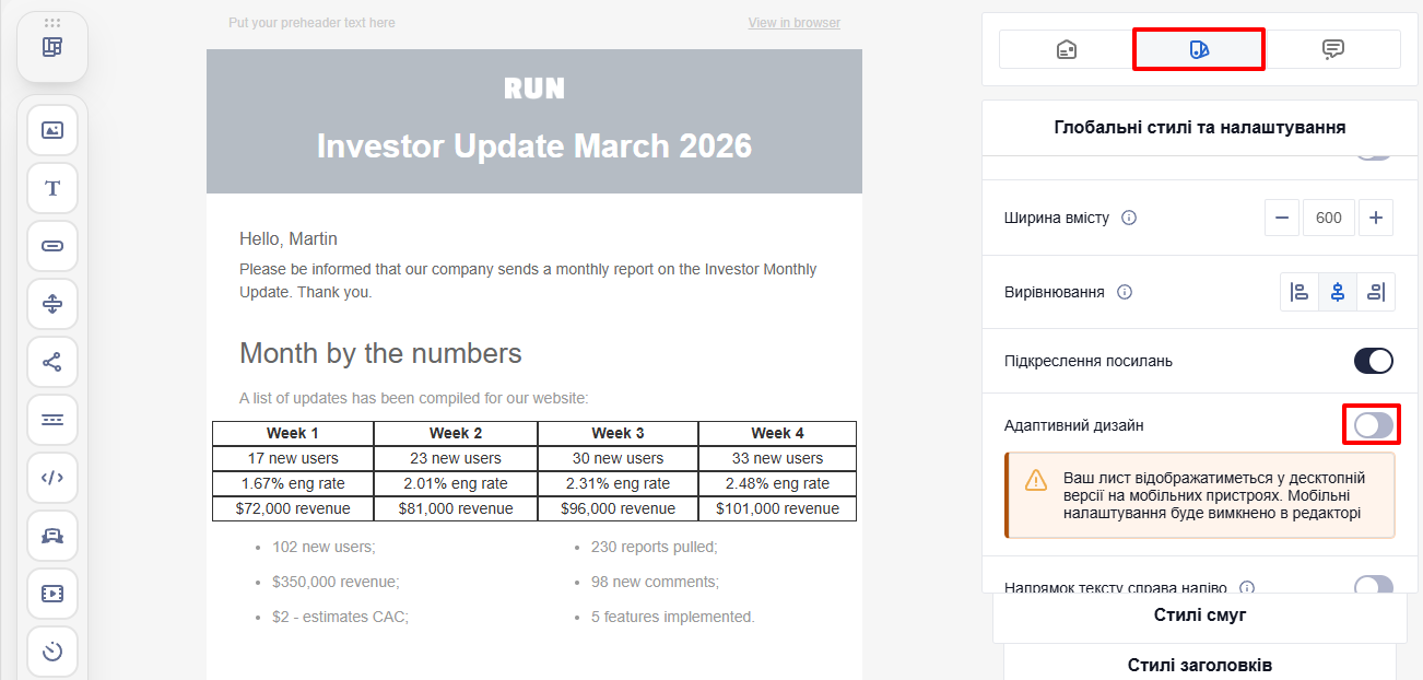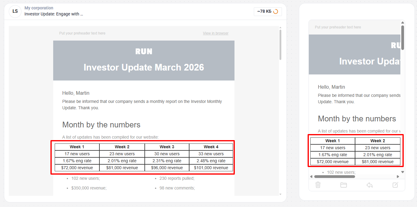 ВажливоТаблиця, створена в текстовому блоці, відображається однаково в десктопній і мобільній версіях листа та не залежить від увімкнення опції Адаптивний дизайн.