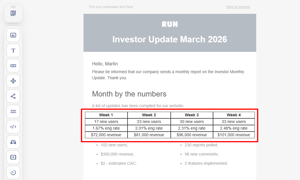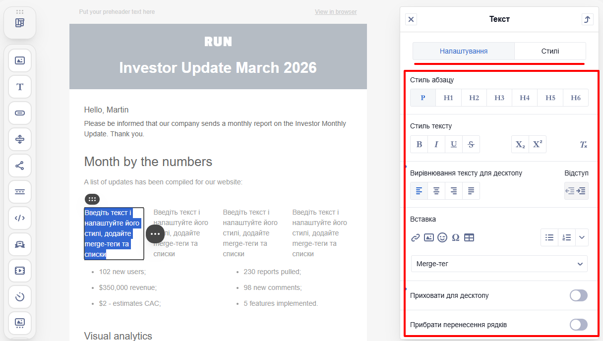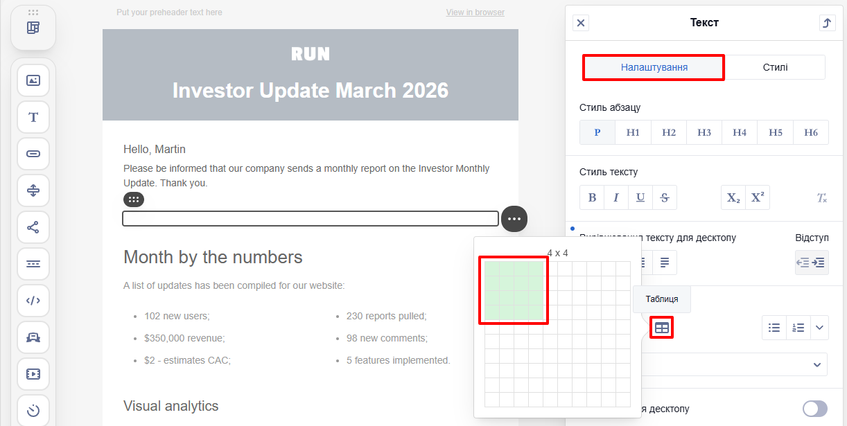 У редакторі eSputnik ви можете створити таблицю без використання зовнішніх інструментів.