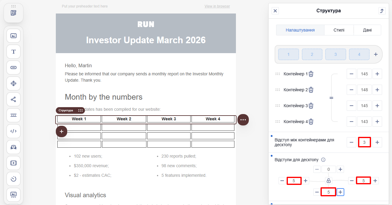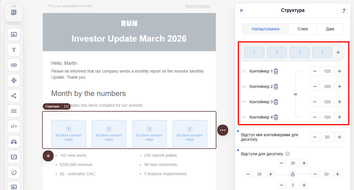 - За потреби змініть кількість контейнерів, їхню ширину та відступи в налаштуваннях структури.