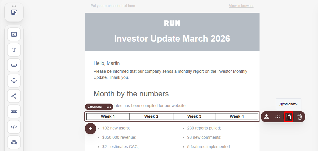 - Щоб додати рядки, наведіть курсор на структуру та натисніть Дублювати.