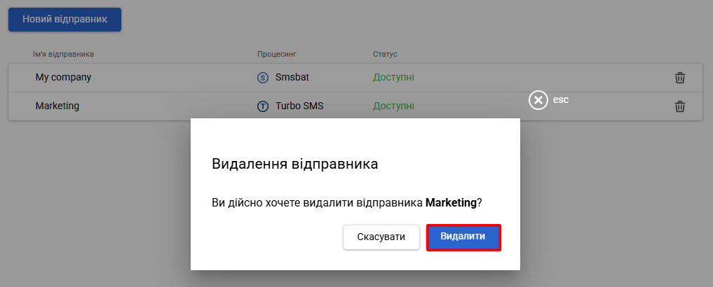 Доданий відправник з'явиться у списку зі статусом Доступні: