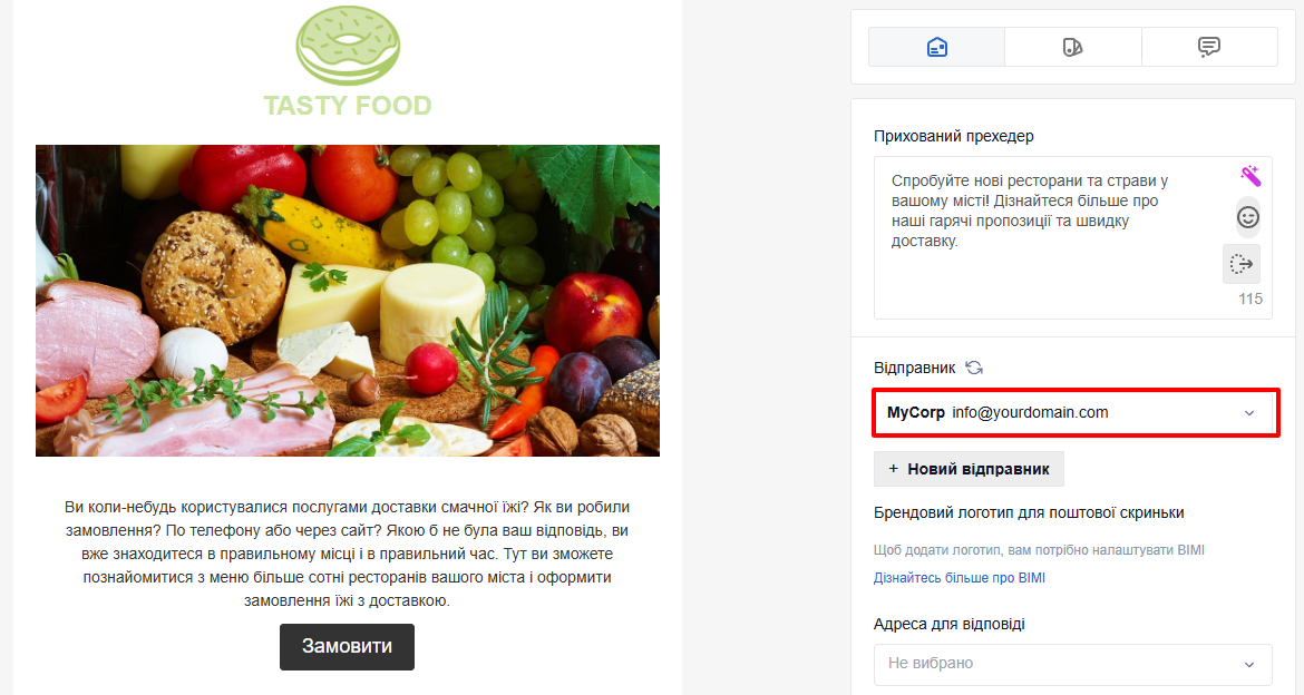Щоб змінити відправника в email-редакторі, натисніть поточне імʼя відправника та виберіть інше зі списку.