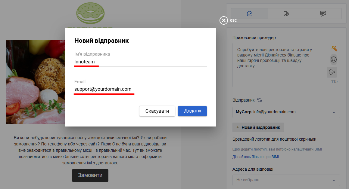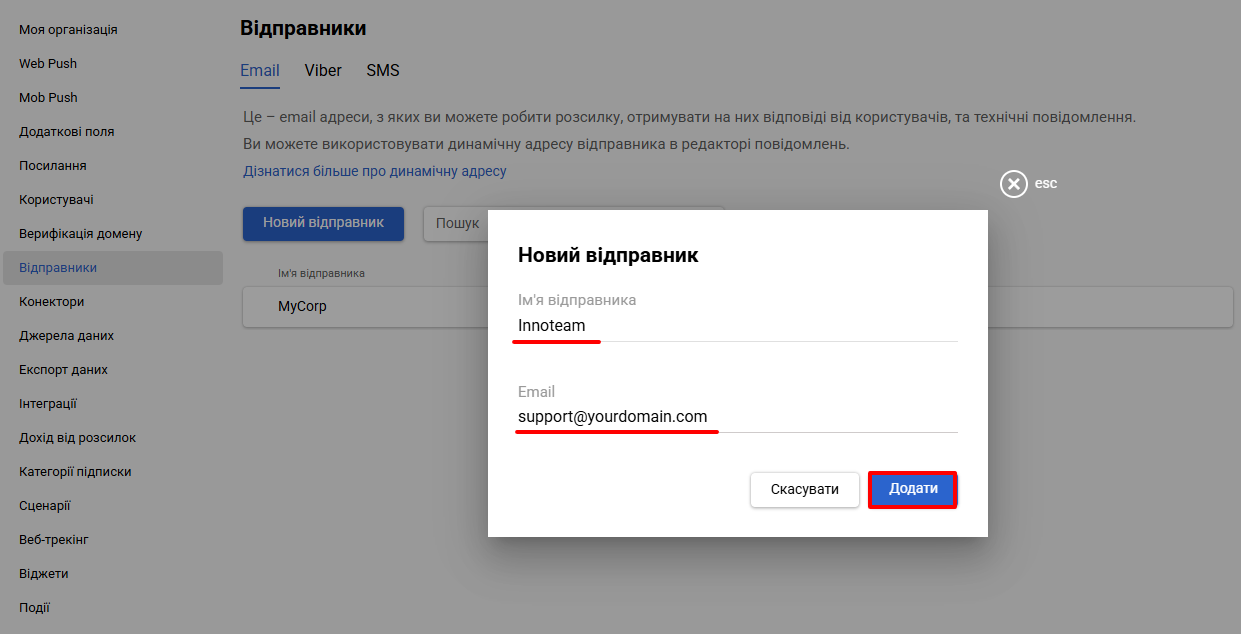 - Вкажіть Імʼя відправника, email та натисніть Додати.