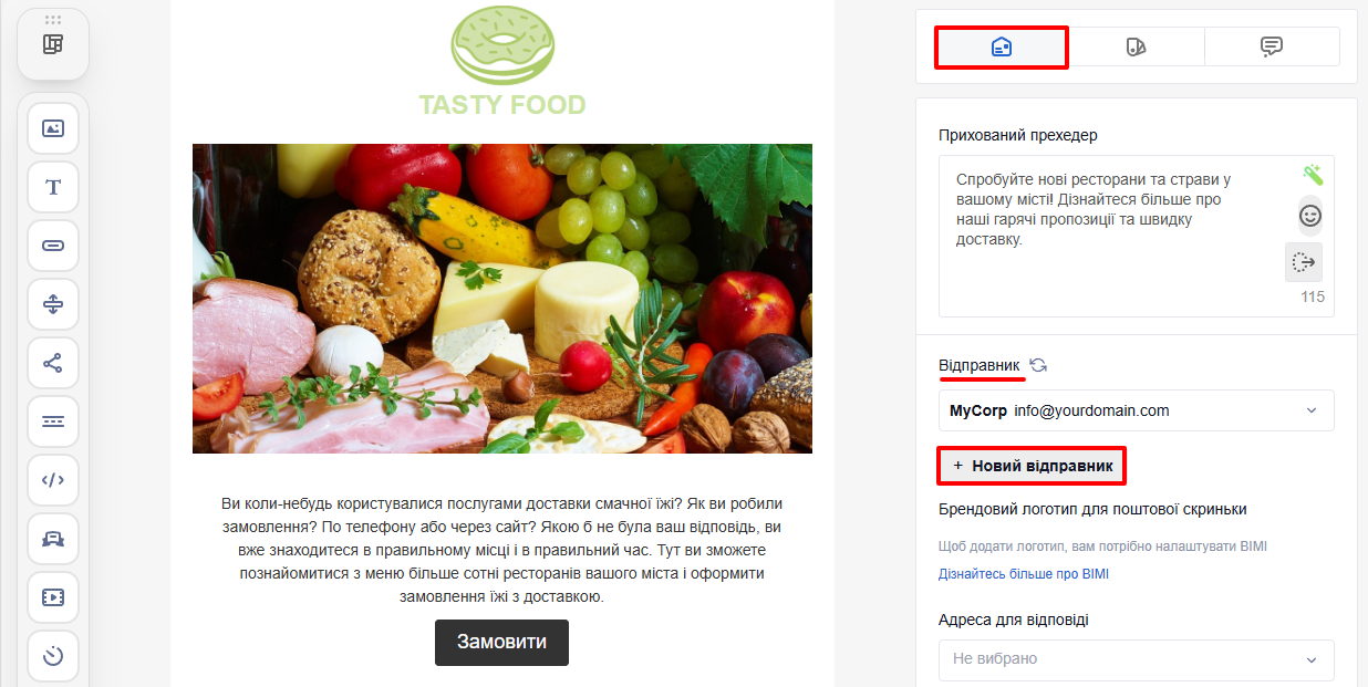 - На панелі Налаштування листа перейдіть до секції Відправник і натисніть кнопку + Новий відправник.