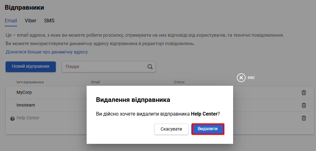 - Натисніть іконку кошика поруч із потрібним відправником.