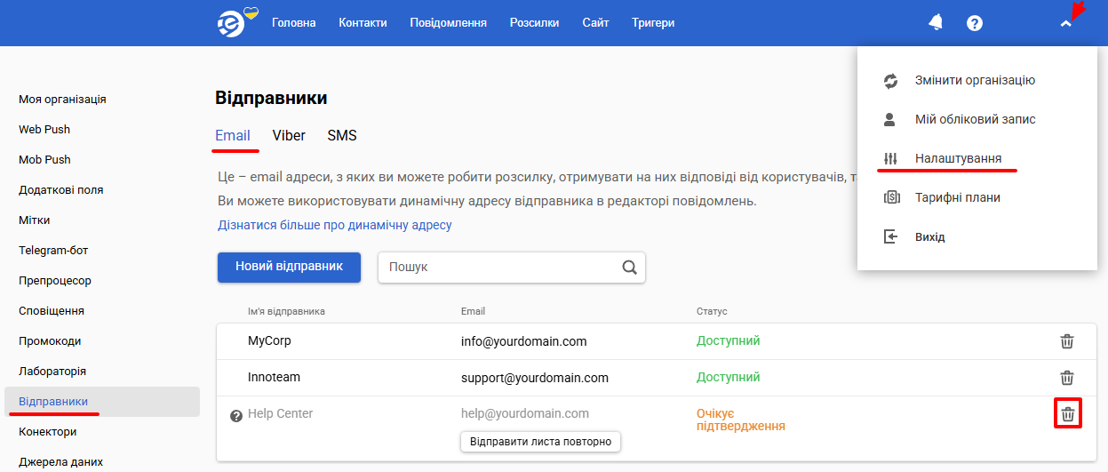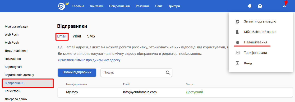 - Перейдіть до налаштувань облікового запису → Відправники → Email.