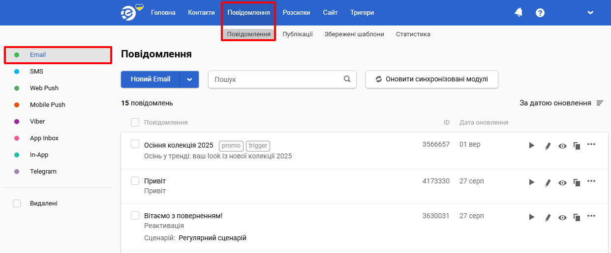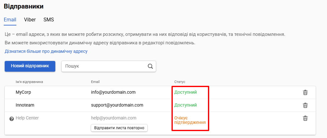 - Перейдіть до Налаштування → Відправники → Email та натисніть Новий відправник.