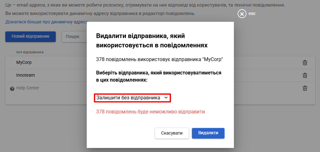 Якщо відправник використовується в повідомленнях, виберіть нового відправника або опцію Залишити без відправника.