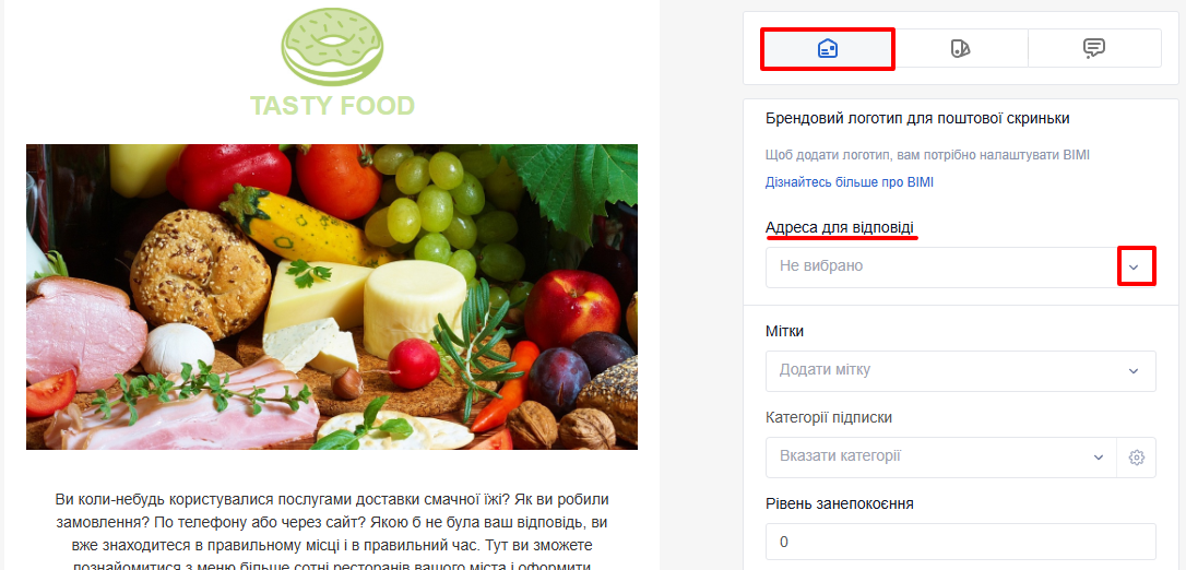Налаштування адреси для відповіді аналогічне додаванню відправника в email-редакторі.
