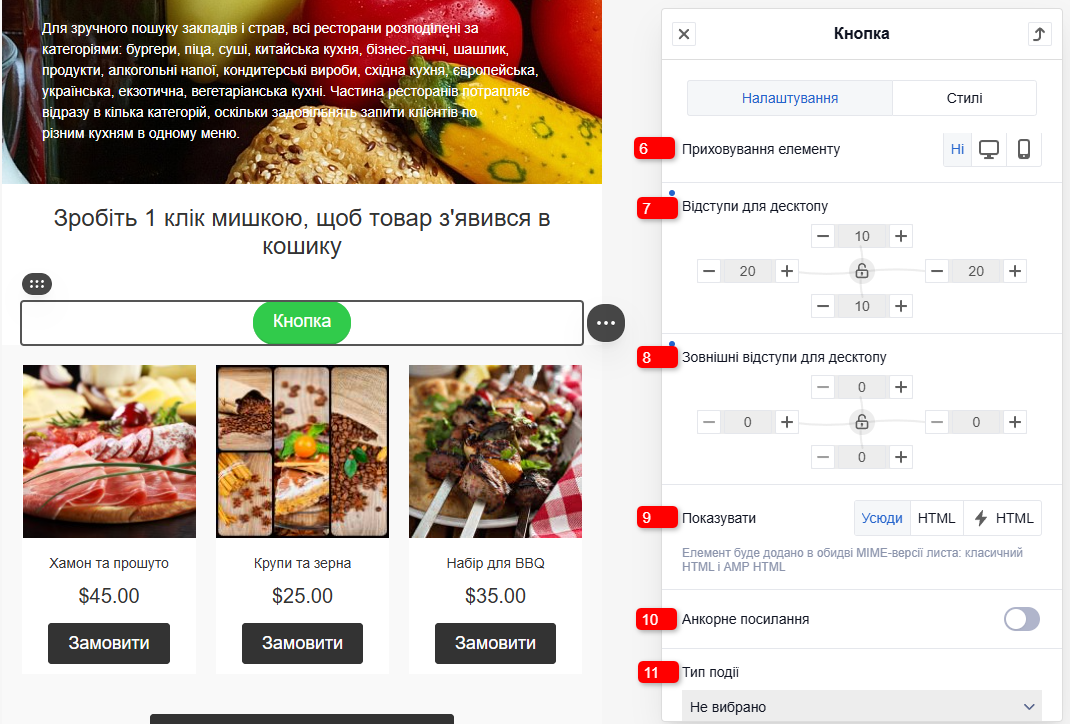 - Приховування елемента. Увімкніть, якщо потрібно приховати кнопку в десктопній або мобільній версії листа.