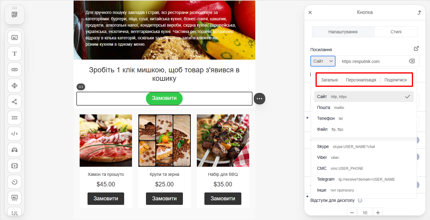 http,https), пошта (mailto), телефон (tel), файл (ftp,ftps), skype, viber, sms, telegram, інше. - Персоналізація: динамічне посилання.